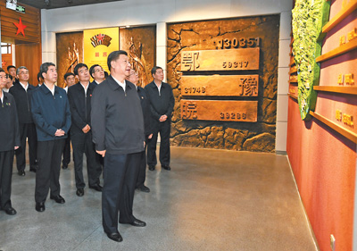 接著,習(xí)近平來到鄂豫皖蘇區(qū)首府革命博物館,了解鄂豫皖蘇區(qū)的革命歷史。鄂豫皖蘇區(qū)是中國共產(chǎn)黨在土地革命戰(zhàn)爭(zhēng)時(shí)期領(lǐng)導(dǎo)創(chuàng)建的根據(jù)地之一,是僅次于中央蘇區(qū)的第二大革命根據(jù)地,誕生了多支紅軍主力,創(chuàng)造了“28年紅旗不倒”的奇跡。解放戰(zhàn)爭(zhēng)時(shí)期,這里是劉鄧大軍千里挺進(jìn)大別山的落腳地。博物館展陳了許多珍貴的革命文物,習(xí)近平駐足察看,不時(shí)同大家交流,追憶崢嶸歲月。習(xí)近平強(qiáng)調(diào),開展“不忘初心、牢記使命”主題教育,黨員、干部要多學(xué)黨史、新中國史,自覺接受紅色傳統(tǒng)教育,常學(xué)常新,不斷感悟,鞏固和升華理想信念。革命博物館、紀(jì)念館、黨史館、烈士陵園等是黨和國家紅色基因庫。要講好黨的故事、革命的故事、根據(jù)地的故事、英雄和烈士的故事,加強(qiáng)革命傳統(tǒng)教育、愛國主義教育、青少年思想道德教育,把紅色基因傳承好,確保紅色江山永不變色。