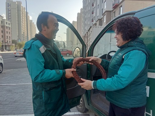 內蒙古自治區包頭市郵政分公司東河區分公司惠民攬投部主任邢愛萍(右)為駕駛員聞杰(左)送上了特別準備的保暖方向盤套,為員工的冬季外出作業提供有效保護。□白新華 攝影報道