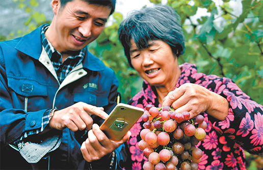張海洋與趙本增一道發起現場直播后,到自家葡萄園采摘的游人比以往多多啦。圖為地頭直播現場。