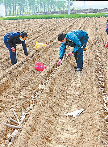 看到誰家忙不過來,趙本增只要有空就會主動上前搭把手。圖為春耕時節,趙本增與支局的幾位同事幫助村民王大柱種植山藥。