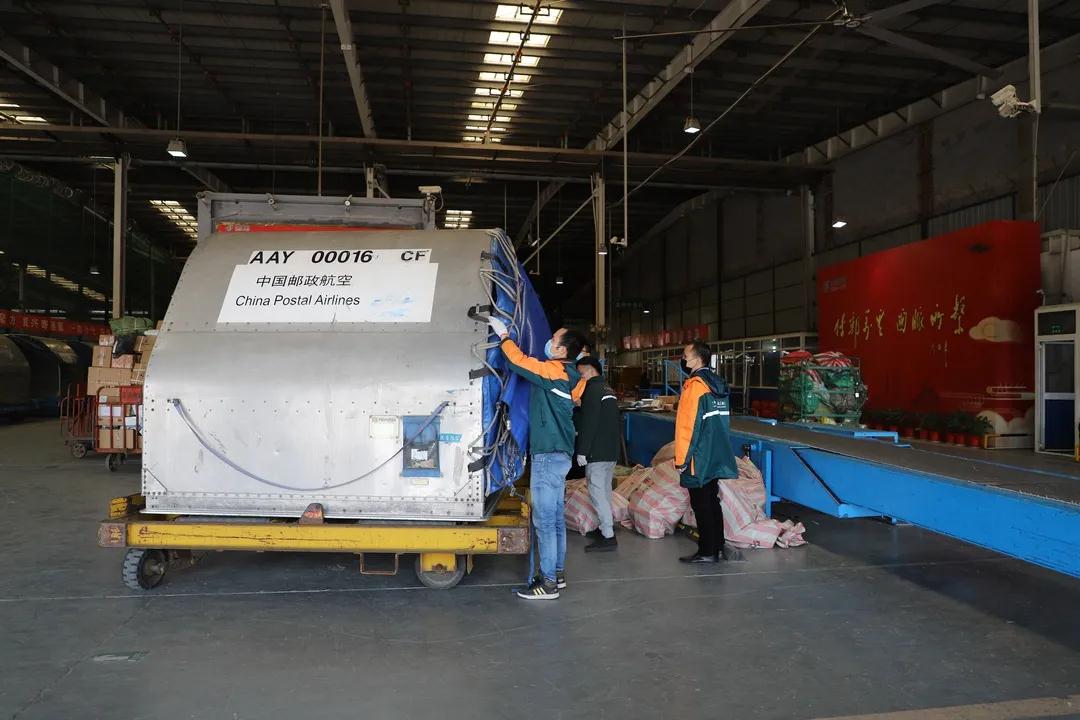 哈爾濱郵區中心局員工將郵航包機運抵的醫用物資進行裝車。