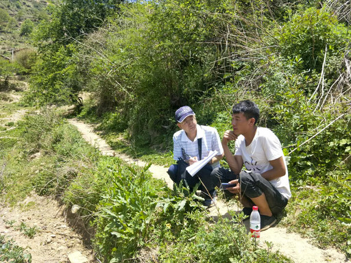 高旭闖在田邊調查詢問農戶外出務工、子女就讀、種植養殖等情況。