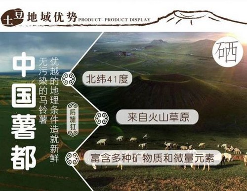 “后旗紅”土豆是馬鈴薯的一個品種,因種植在中國薯都烏蘭察布察右后旗而得名。“后旗紅”馬鈴薯種植基地位于察哈爾火山地質公園火山群下,北緯41度。采用微噴方式,水源來自150米火山巖下深層礦泉水。其產地烏蘭察布察哈爾右翼后旗,地屬溫帶大陸性季風氣候,無霜期短、晝夜溫差大,降雨集中在馬鈴薯生長期季節(jié),雨熱同季,土壤為沙性土,為馬鈴薯生長提供了得天獨厚的優(yōu)越條件。
