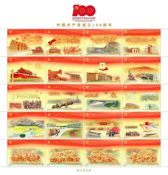 紀念郵票內(nèi)容為:1.開天辟地。表現(xiàn)元素:上海黨的一大會址、嘉興南湖紅船、“五四”運動(人民英雄紀念碑浮雕)、旭日東升。2.崢嶸歲月。表現(xiàn)元素:南昌起義(人民英雄紀念碑浮雕)、井岡山革命遺址、遵義會議遺址、飛奪瀘定橋。3.中流砥柱。表現(xiàn)元素:延安寶塔山、《論持久戰(zhàn)》、抗日戰(zhàn)爭(人民英雄紀念碑浮雕)。4.偉大勝利。表現(xiàn)元素:西柏坡、香山雙清別墅、渡江戰(zhàn)役(人民英雄紀念碑浮雕)。5.開國大典。表現(xiàn)元素:開國大典時的天安門、華表、禮花。6.抗美援朝。表現(xiàn)元素:跨過鴨綠江、凱旋門、和平鴿、橄欖枝。7.制度奠基。表現(xiàn)元素:五四憲法、人民大會堂、社會主義改造。8.自力更生。表現(xiàn)元素:兩彈一星、大慶油田、南京長江大橋、十三陵水庫。9.改革春潮。表現(xiàn)元素:十一屆三中全會公報、小崗村大包干紀念雕塑、恢復高考。10.對外開放。表現(xiàn)元素:深圳拓荒牛雕塑、上海南浦大橋和廈門、珠海、汕頭經(jīng)濟特區(qū)。11.世紀騰飛。表現(xiàn)元素:三峽大壩、香港金紫荊雕塑、澳門金蓮花雕塑、中國加入世貿(mào)組織、上海APEC會議。12.科學發(fā)展。表現(xiàn)元素:神舟五號、青藏鐵路、蛟龍?zhí)栞d人潛水器、國家體育場(鳥巢)。13.擺脫貧困。表現(xiàn)元素:十八洞村、閩寧鎮(zhèn)、懸崖村、農(nóng)村豐收場景、無人機播撒、光伏發(fā)電等。14.全面小康。表現(xiàn)元素:GDP突破100萬億、生態(tài)文明(兩山理論)、教育、醫(yī)療、抗擊疫情等成就。15.強軍興軍。表現(xiàn)元素:古田全軍政治工作會議、閱兵方隊、國產(chǎn)航母山東艦、殲20、東風41導彈和信息化作戰(zhàn)裝備。16.揚帆遠航。表現(xiàn)元素:現(xiàn)代巨輪、中國夢、56個民族、“一帶一路”、復興號高鐵、大興機場、北斗衛(wèi)星等。17.信仰。表現(xiàn)元素:“信仰”雕塑,襯托背景為泰山圖案。18.偉業(yè)。表現(xiàn)元素:“偉業(yè)”雕塑,襯托背景為壺口瀑布圖案。19.攻堅。表現(xiàn)元素:“攻堅”雕塑,襯托背景為長江圖案。20.追夢。表現(xiàn)元素:“追夢”雕塑,襯托背景為長城圖案。紀念郵票總面值24元。紀念郵票采用連票設計形式,以紅色、金色為畫面主基調(diào),運用油畫寫實手法表現(xiàn),并采用連綿不斷的飄帶貫穿整體,寓意中國共產(chǎn)黨百年奮斗的光輝歷程。