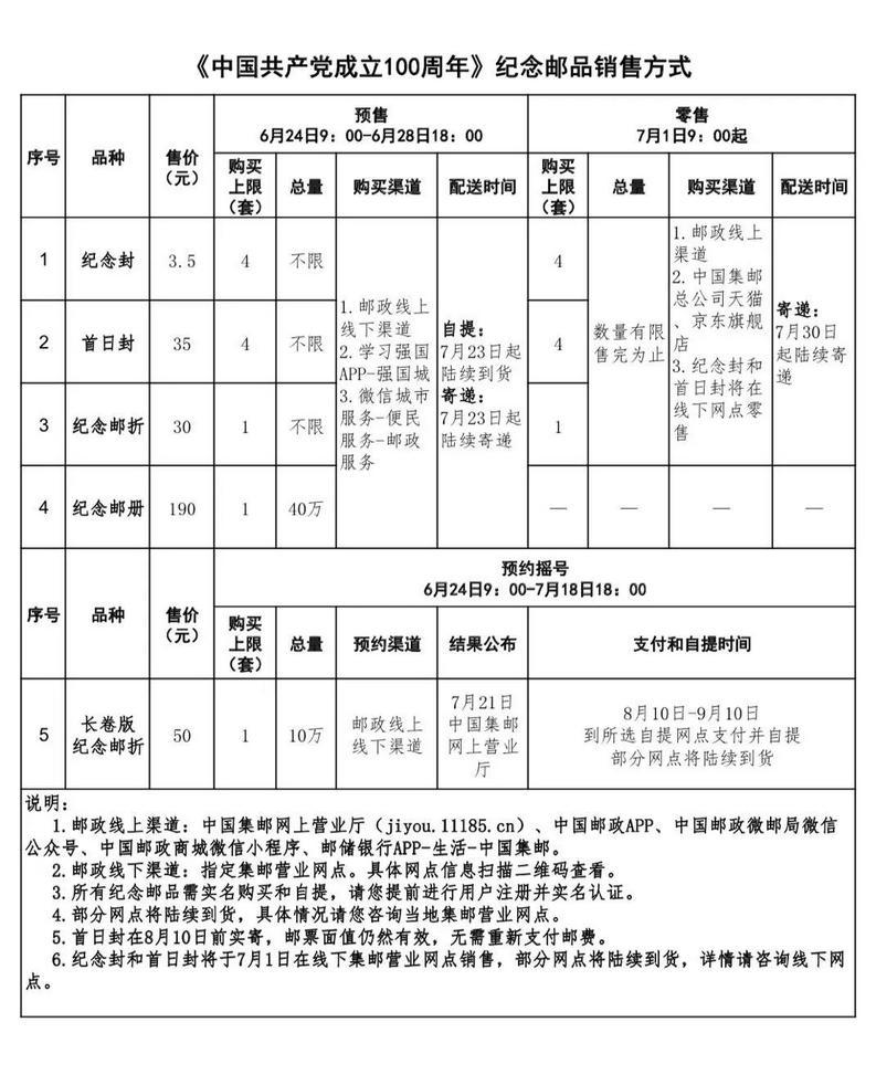 搖號品種及數(shù)量:長卷版紀(jì)念郵折內(nèi)含《中國共產(chǎn)黨成立100周年》長卷郵票折1本,售價(jià)50元。線上線下共10萬個(gè)中簽指標(biāo)。每人具有1次搖號資格。
