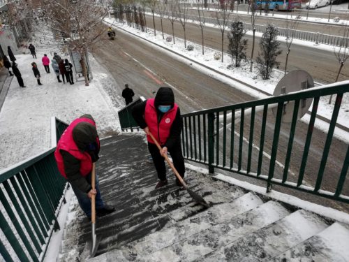 清雪過程中,志愿者們不懼嚴寒、揮動掃把、拿起鐵鍬,在街路、天橋、小區、廣場等地除雪除冰。雖然室外天寒地凍,但他們熱情高漲、干勁不減,用實際行動踐行著為民服務的熾熱情懷。同時,廣大志愿服務團隊還廣泛宣傳、動員市民積極行動起來,將自家周邊的積雪清理干凈,并勸導老人、兒童暴雪天氣非必要減少外出,讓市民群眾切實感受到志愿服務的溫暖。