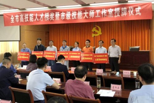 近日,六安市人社局舉行全市高技能人才授獎暨市級技能大師工作室授牌儀式。盧海龍因獲得“第五屆安徽省技能大獎”榮譽稱號,上臺接受表彰。在獲得省人社廳5萬元獎勵的基礎上,市人社局再獎勵6萬元,累計獲得獎勵11萬元。