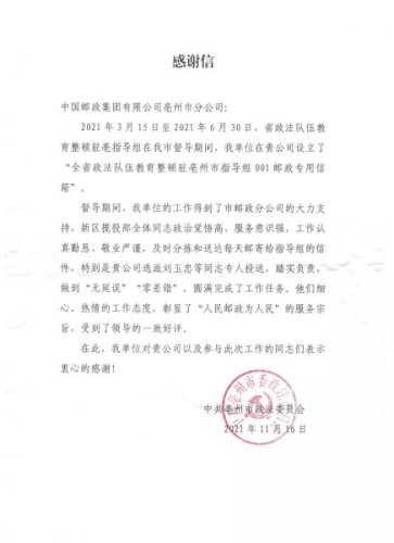 2021年3月15日至6月30日,省政法隊(duì)伍教育整頓駐亳指導(dǎo)組在亳州督導(dǎo)期間,在亳州郵政申請開通了專用信箱用于接收相關(guān)郵件。亳州市分公司新區(qū)攬投部政治覺悟高,服務(wù)意識(shí)強(qiáng),工作認(rèn)真勤懇,嚴(yán)謹(jǐn)敬業(yè),每天及時(shí)分揀和投遞信件,做到“無延誤”“零差錯(cuò)”,圓滿完成了工作任務(wù)。