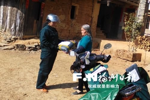 閩清縣上蓮鄉(xiāng)的高山上,一座簡(jiǎn)陋的土墻瓦房前駛來(lái)一輛摩托車(chē),身穿綠色工服的女郵遞員支好車(chē),將一個(gè)包裹遞給住在這里的一位老奶奶。包裹里,是老奶奶的晚輩為她網(wǎng)購(gòu)的日用品。