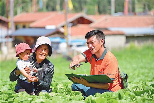 在“郵政+農(nóng)民合作社”示范基地,哈弄奪機(jī)和種植戶一起查看萵筍使用郵政農(nóng)資后的長勢。