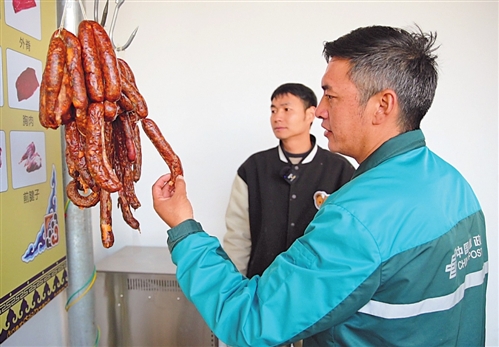 在直播間,牦牛肉腸很受歡迎,直播前哈弄奪機都要仔細查看貨源品質(zhì)。□張晉通 攝