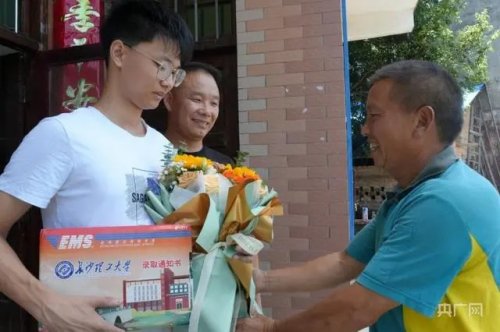 “譚醫(yī)生,你兒子的錄取通知書到啦。”郵車還未停下,喜報(bào)聲便搶先“進(jìn)門”,拿起錄取通知書后,吳江南捧出一束郵局準(zhǔn)備的鮮花。“沙明村考上個(gè)大學(xué)生不容易,這也是我們的一份心意。”