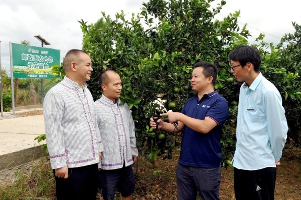 在蔻橙種植基地,郵政邀請中化測土配方專家走到橙園里,為合作社社員提供農資農技服務。專家鉆進果園,現場教學。在合作社郵政示范園,專家周喜武將PH值測試儀插入土壤,數值顯示為6.8,“現在土壤PH值為6.8,屬于酸性土壤,利于蔻橙的生長”。