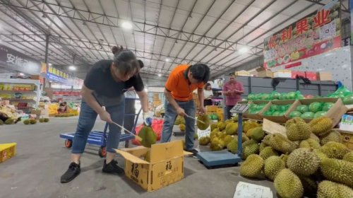 采訪完徐鈺鋒,記者跟隨潘新杰來到離郵政倉不遠的水果市場,為當日線上訂單客戶挑選榴蓮?!傲裆徱ㄟ^敲打來分辨生熟程度。偏生,就適合發(fā)較遠的地區(qū);偏熟,則適合發(fā)往近的地方,這樣可以保證客戶收到水果時生熟正好。如果天氣熱,還要加冰來保證果肉新鮮。芒果如果是發(fā)到東北,我們會加裝保溫袋來避免水果凍傷?!闭f起不同水果的“發(fā)運經(jīng)”,潘新杰滔滔不絕。