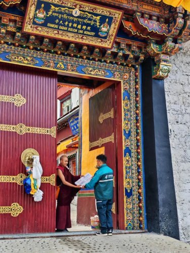 步行10分鐘,羅布多吉來到拉郊鄉(xiāng)政府,將《人民日報》和郵件送達(dá)后,便驅(qū)車前往德瑪龍村。