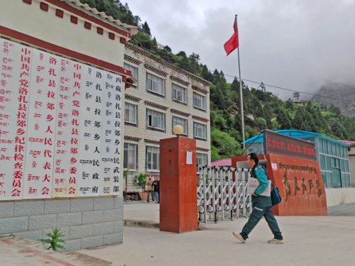 細(xì)雨連綿,道路濕滑。一路顛簸,提心吊膽,兩個小時后,郵車來到了德瑪龍村,藏式的建筑群整齊排列,五星紅旗懸掛在每戶大門上,沿街墻上張貼著“黨的光輝照邊疆 邊疆人民心向黨”等標(biāo)語。