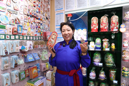 7月25日一大早,采訪組一行到達位于中俄邊境的滿洲里第五代國門。在位于國門景區(qū)的入口處,占地200多平方米的滿洲里國門主題郵局格外吸睛。進入主題郵局,映入眼簾的是各類多巴胺色的文創(chuàng)產(chǎn)品,其中一款“綠皮火車穿越國門”圖案的冰箱貼凸顯地標(biāo)特色,尤其受到游客歡迎。該主題郵局負責(zé)人項欣說:“我們主題郵局里有郵品、文創(chuàng)產(chǎn)品、特色食品等500多種產(chǎn)品,以國門為主題的文創(chuàng)產(chǎn)品和鄂溫克族手工藝品非常受游客喜愛。”