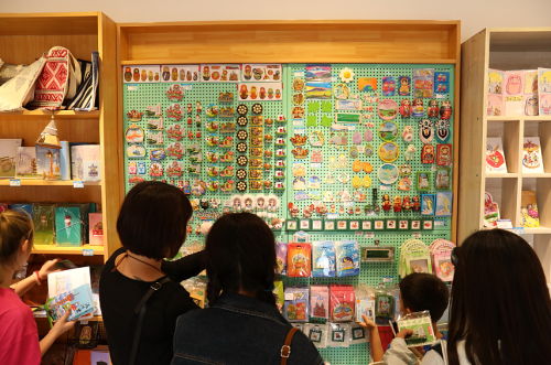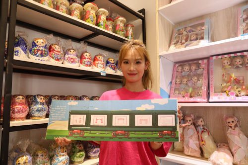 在俄式風(fēng)情拉滿的套娃主題郵局,采訪組一行看到了套娃形狀的郵筒、手繪套娃、套娃明信片、郵折、筆記本、冰箱貼等產(chǎn)品,這些產(chǎn)品吸引了很多小朋友的眼球。來自山東的中學(xué)生張同學(xué)對一款做工精美的套娃愛不釋手:“感覺來到這里就像到了俄羅斯,這里的套娃都太精美了,每一款都想要!”