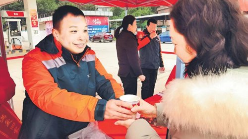 梧州市分公司開展?fàn)I銷活動(dòng),朱哲給客戶遞上熱水。