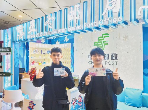 “我剛剛選了一套單板滑雪的紀(jì)念郵票和亞冬會(huì)倒計(jì)時(shí)50天紀(jì)念郵資封。因?yàn)楹軜s幸被選為亞冬會(huì)志愿者,我覺(jué)得應(yīng)該留下一些值得紀(jì)念的東西,正好看到了亞冬會(huì)郵局里的產(chǎn)品特別精美,也特別契合這次亞冬會(huì)的主題,很有意義。”高中生志愿者呂文博開(kāi)心地說(shuō)。而他的同學(xué)在看到他手中的紀(jì)念郵品時(shí)也很喜歡,在呂文博的指引下來(lái)到郵局購(gòu)買(mǎi)了幾枚明信片。郵政工作人員得知他是為了收藏紀(jì)念,特意為他選了精美的郵戳加蓋在明信片上。