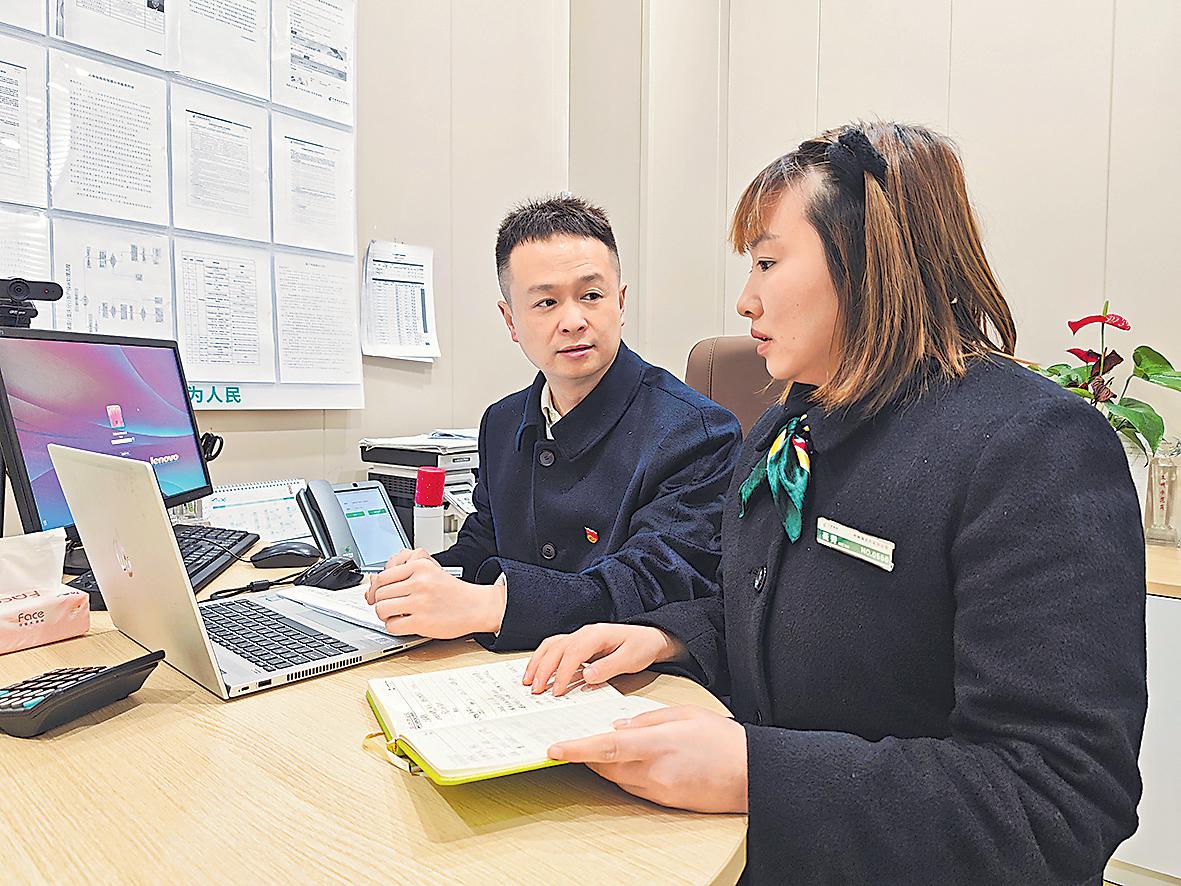 蔣源(左)指導(dǎo)理財經(jīng)理為客戶制定理財方案。□胡陵 攝