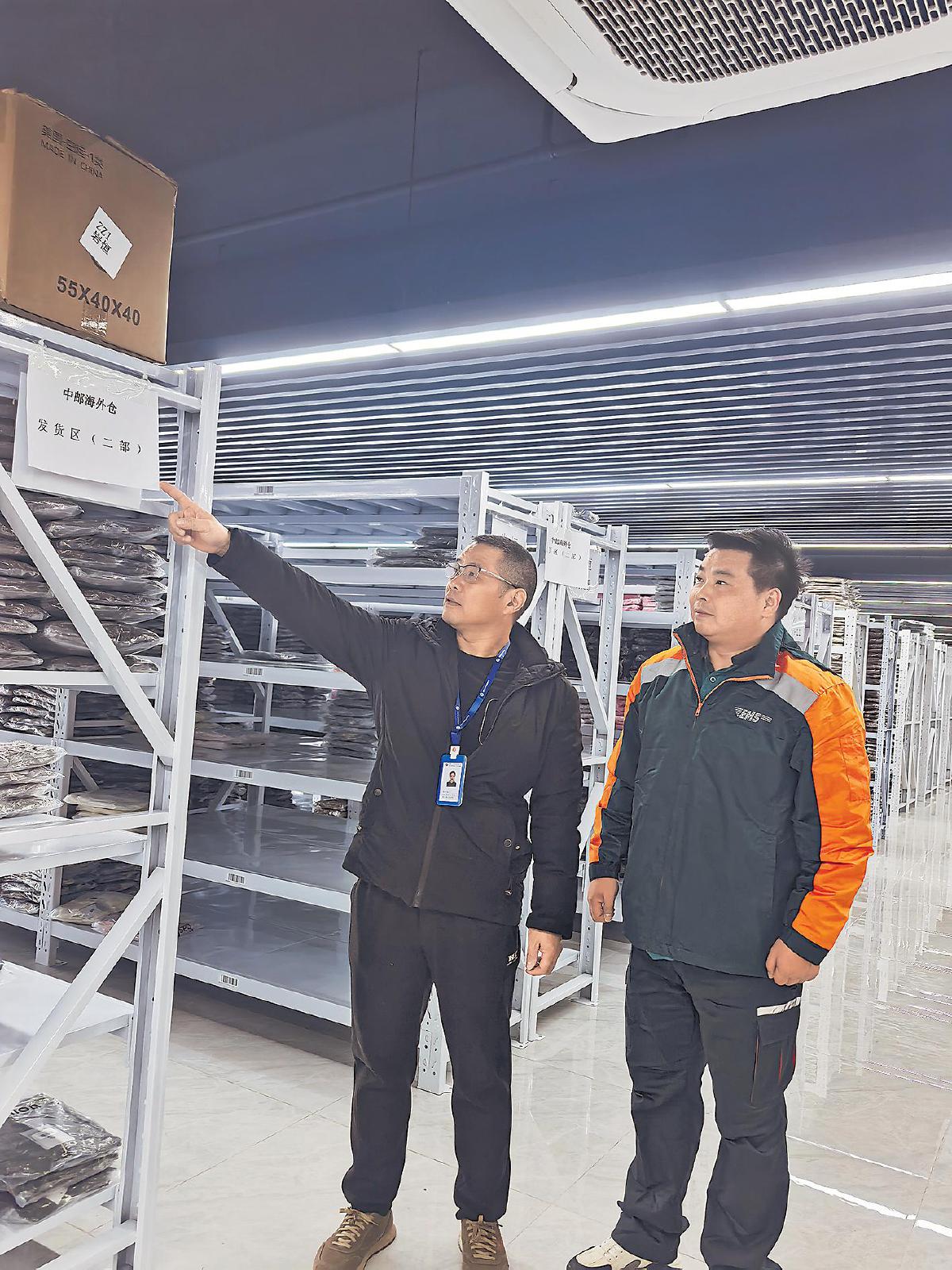 王晶(右)陪同客戶參觀考察中郵海外倉。