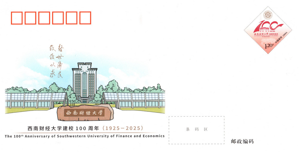 中國郵政定于2025年6月3日發(fā)行《西南財經(jīng)大學(xué)建校100周年》紀(jì)念郵資信封1套1枚。詳情如下: